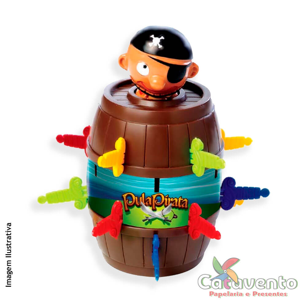 Uma espadinha aqui… outra ali… E de repente o pirata pula fora do barril! Espete o barril com cuidado, porque ninguém sabe quando ele vai pular!