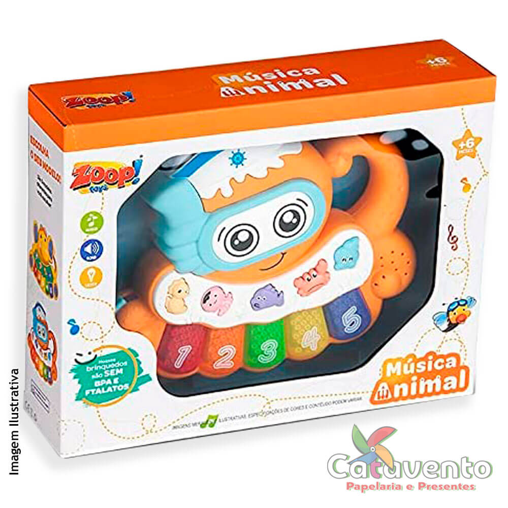 O Polvinho Musical da Zoop Toys é um brinquedo educativo que reproduz várias músicas e sons de animais (porco, macaco, gato e cachorro) com luzes piscantes.